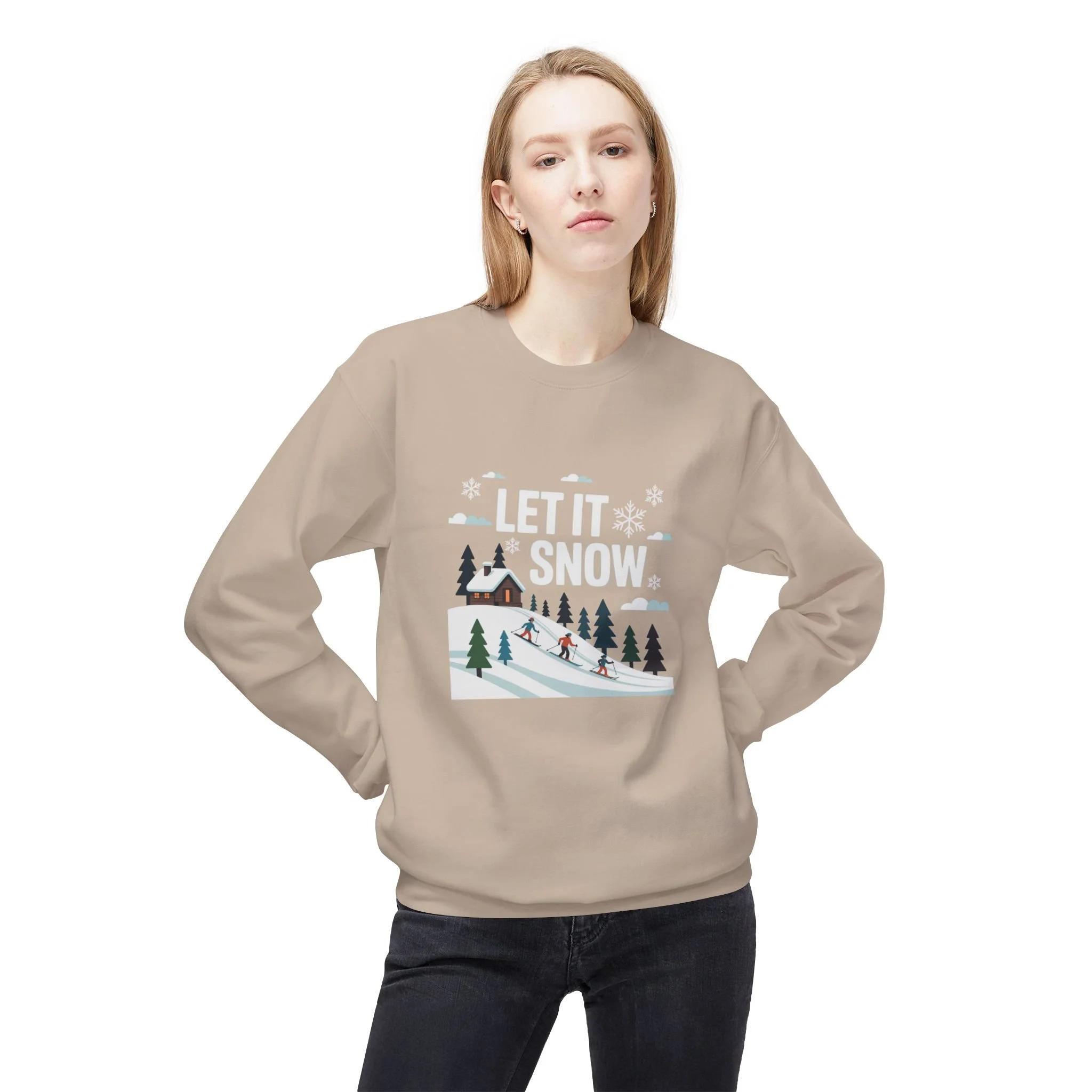 A cozy midweight crewneck that brings a soft winter scene into your everyday rotation. The sweatshirt’s muted sand tone makes the white “Let It Snow” illustration and small ski-lodge vignette feel like a warm memory—snow-dusted pines, skiers carving a gentle slope, and a tucked-away cabin under falling flakes. It drapes relaxed across the shoulders and keeps shape with spandex-reinforced ribbing, so it’s comfortable when you’re layering for a slow morning cocoa or stepping outside for an evening walk after sunset. Wear it with worn jeans or leggings to carry that hush-of-winter mood through holiday walks, low-key gatherings, or quiet cabin days.