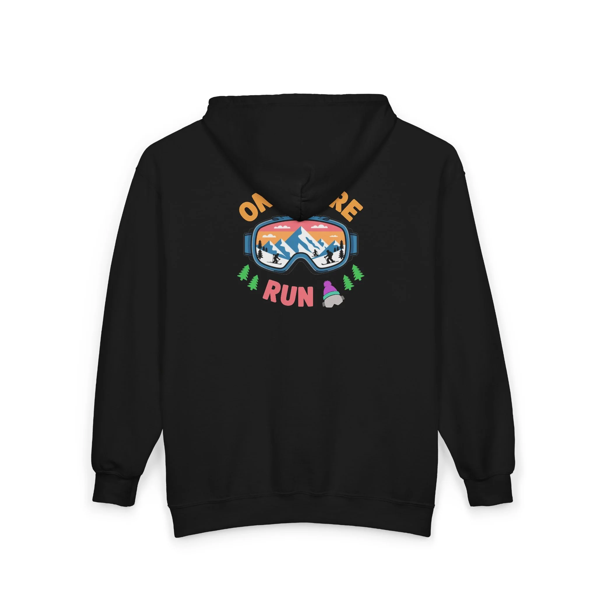 This zip hoodie carries the energy of early-morning trailhead rituals and long, laughter-filled runs into dusk. Soft but sturdy midweight fabric drapes easy over layers while the metal zipper and roomy pockets keep pace with active days. The embroidered left-chest badge and colorful back artwork—mountain peaks seen through goggles with the words “ONE MORE RUN”—celebrate that runner’s itch to go farther. Wear it after a chilly cooldown, on a coffee stop between laps, or draped over shoulders at post-run meetups; it holds warmth, sweat memories, and a quiet pride in every seam.