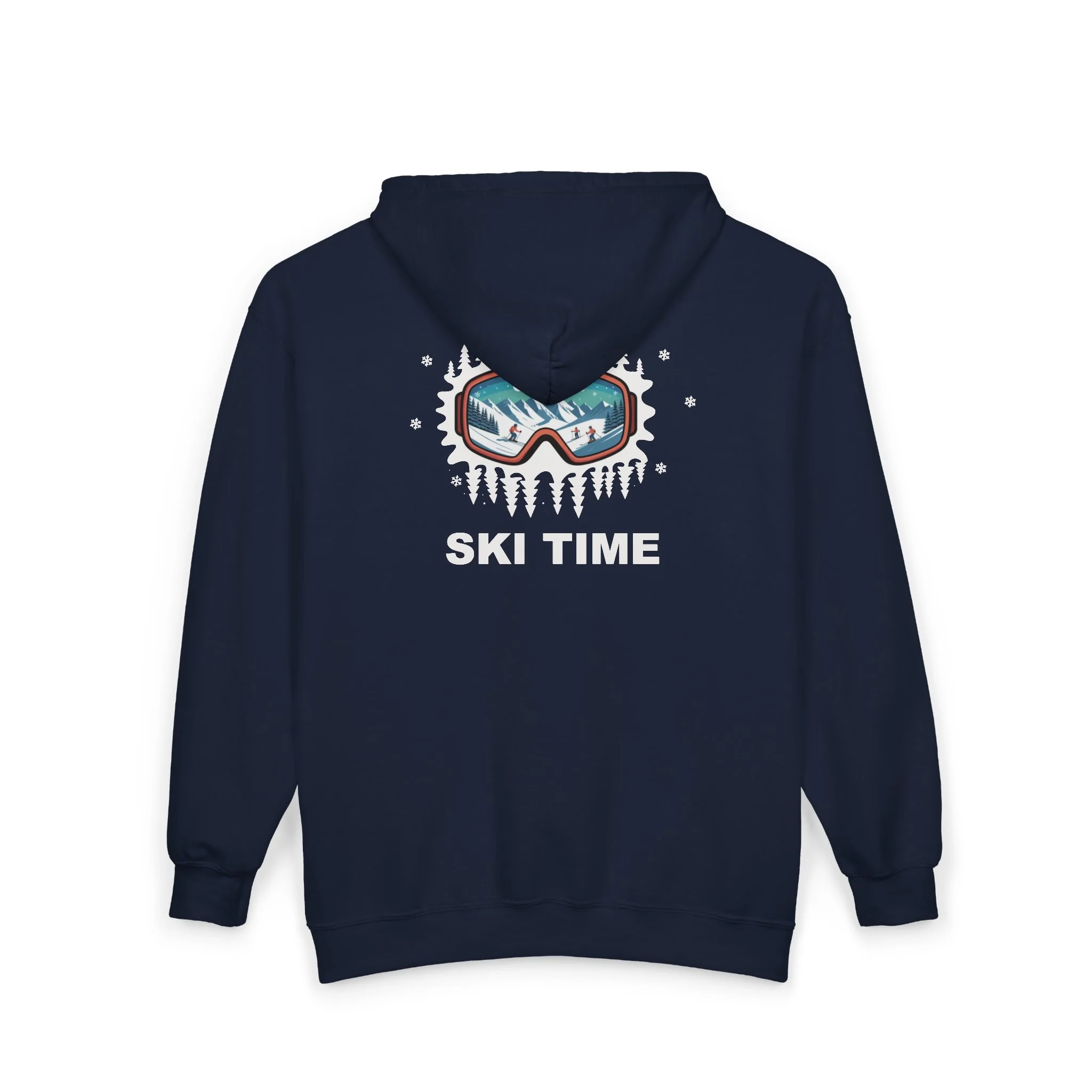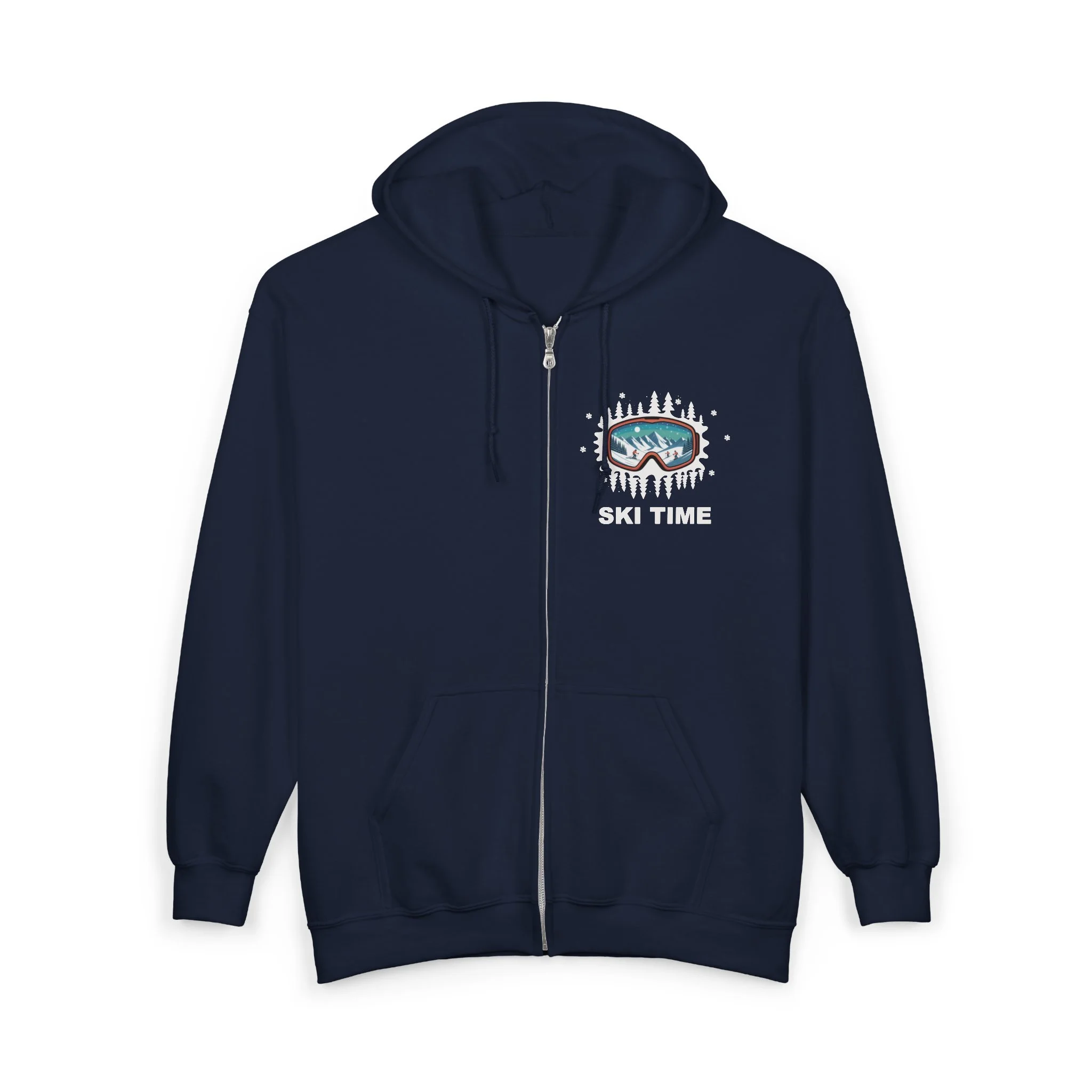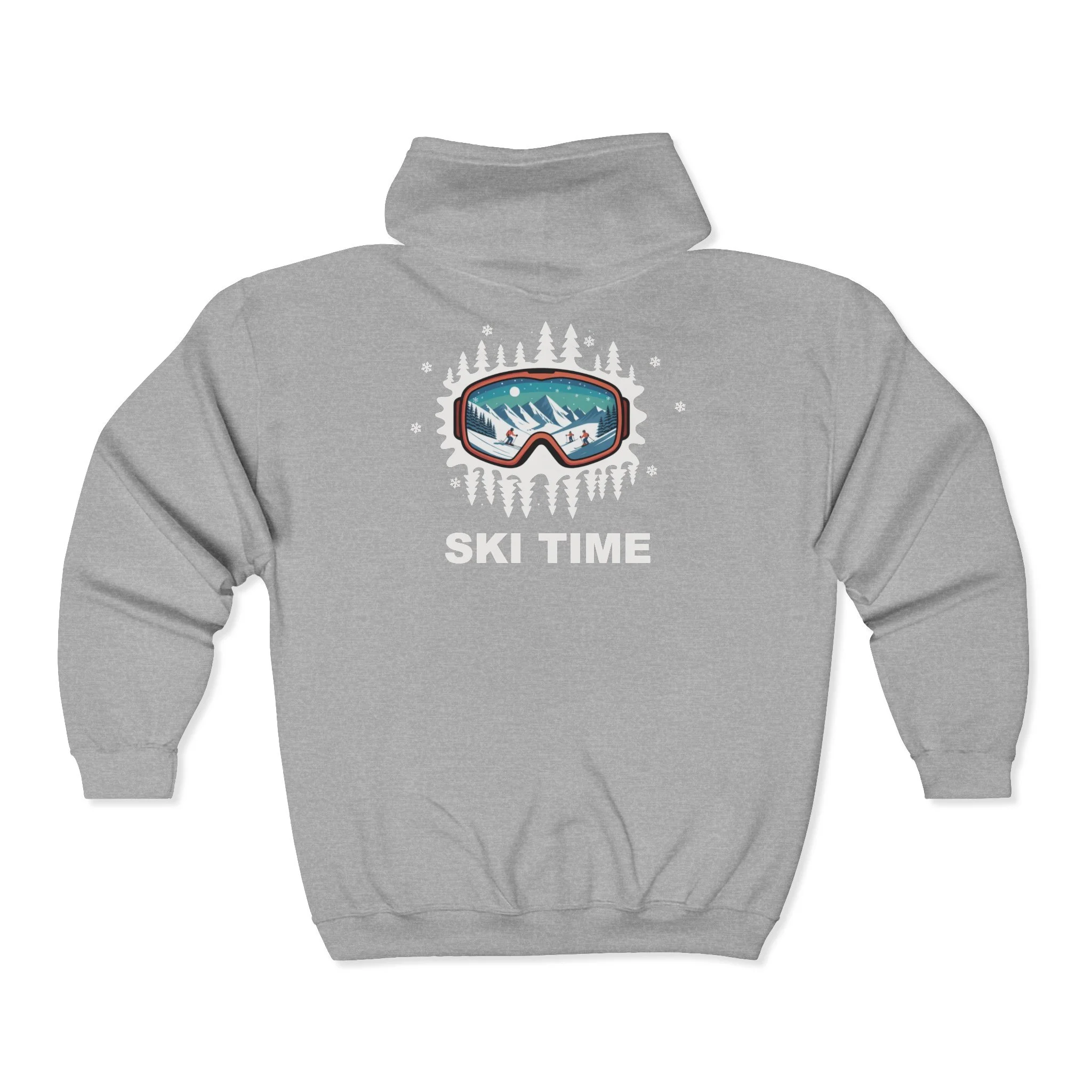 This cozy zip-up hoodie is built for crisp mornings on the mountain and slow evenings by the lodge fire. The front features a small embroidered ski-goggle emblem over the heart, while a bold, frosted goggle graphic and “SKI TIME” headline sit across the back — a quiet shout of winter adventure. The medium-heavy 50/50 cotton-poly fabric holds its shape, traps warmth, and wears well after seasons of use. A roomy hood with drawstring and deep, spacious pockets keep your hands warm and stash your essentials between runs. Classic, true-to-size cut that layers easily over base layers or midweight fleeces; the metal zipper and durable construction mean this will be the hoodie you reach for when the temperature drops and the lifts start spinning.